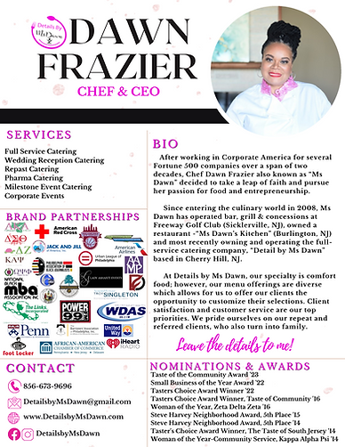 Thank You for considering Details By Ms Dawn for your upcoming catering needs. We offer the services listed below. We would love to cater your event!!!! Please contact us at 856-673-9696 for all additional questions and to discuss your upcoming event.